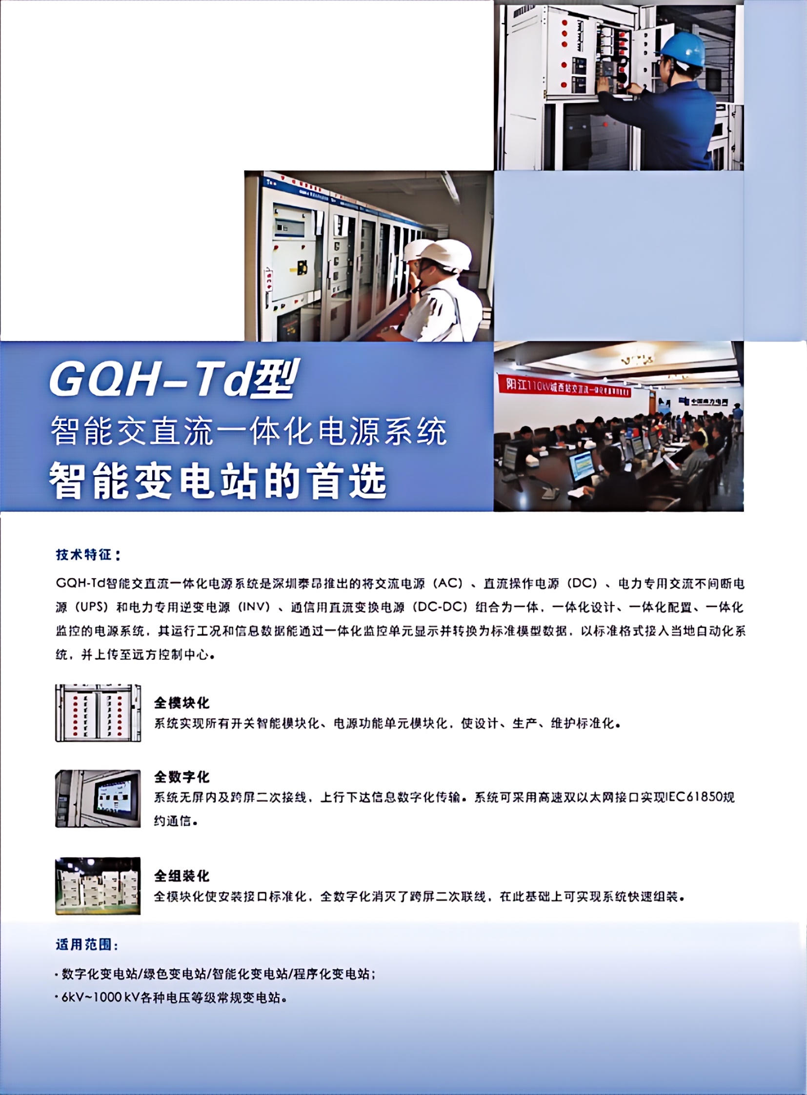 GQH-Td 智能交直流一体化电源系统是将交流电源(AC)、直流操作电源(DC)、电力专用交流不间断电源(UPS)和电力专用逆变电源(INV)、通信用直流变换电源(DC-DC)等站用电源进行一体化设计、一体化配置、一体化监控的电源系统,其运行工况和信息数据能通过一体化监控单元显示并转换为标准模型数据,以标准格式接入当地自动化系统,并上传至远方控制中心。