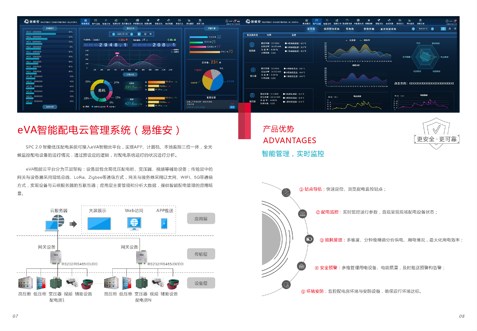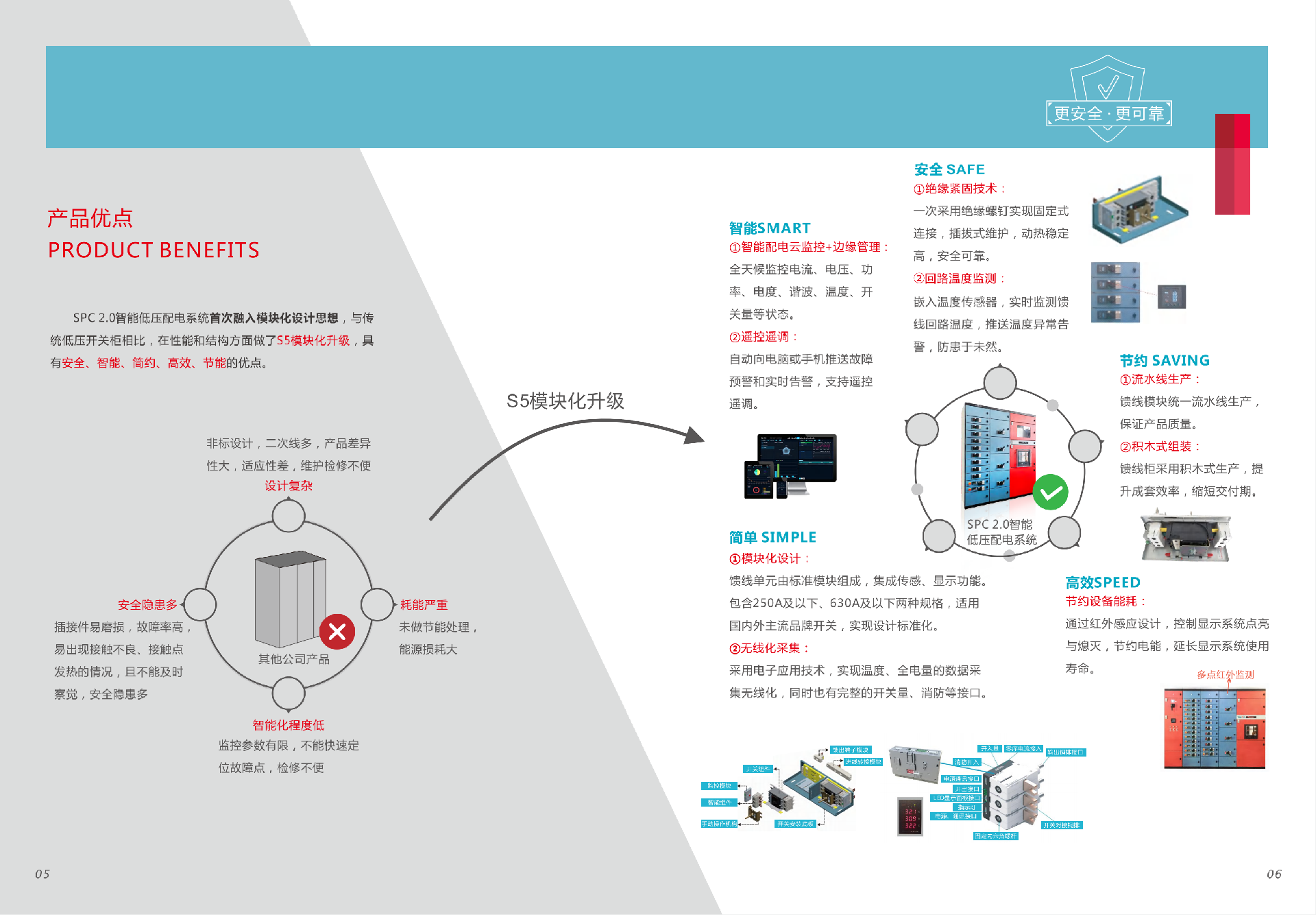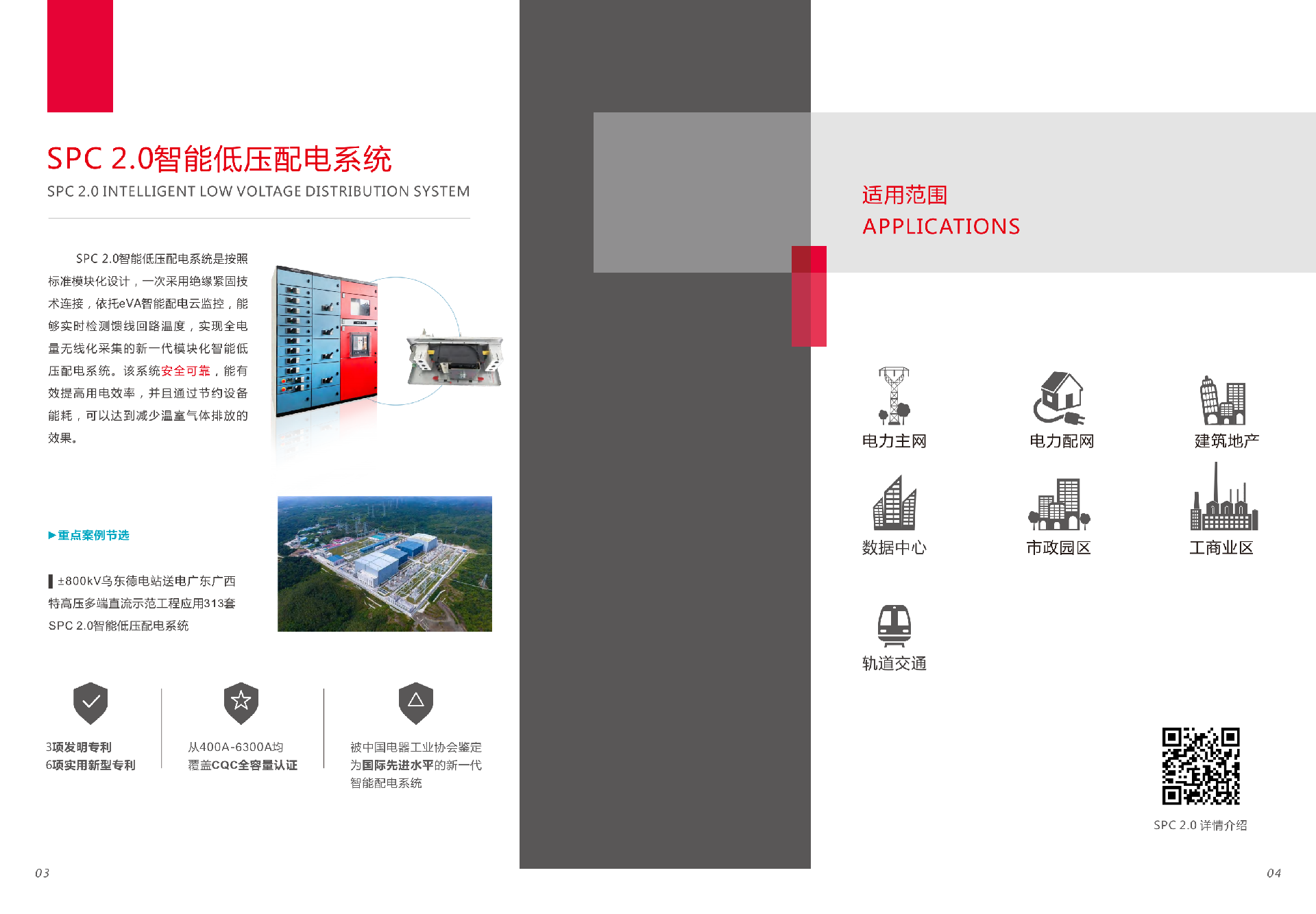 SPC2.0智能低压配电系统是按照标准模块化设计,一次采用绝缘紧固技术连接,依托eVA智能配电云监控,能够实时检测馈线回路温度,实现全电量无线化采集的新一代模块化智能低压配电系统。该系统具有安全(SAFE)、智能(SMART)、简单(SIMPLE)、高效(SPEED)、节约(SAVING)特点,能有效提高用电效率,并且通过节约设备能耗,可以达到减少温室气体排放的效果,被国家科学技术委员会中国电器工业协会鉴定为设计合理、功能齐全、综合性能指标达到同类产品国际先进水平的新一代智能配电系统。