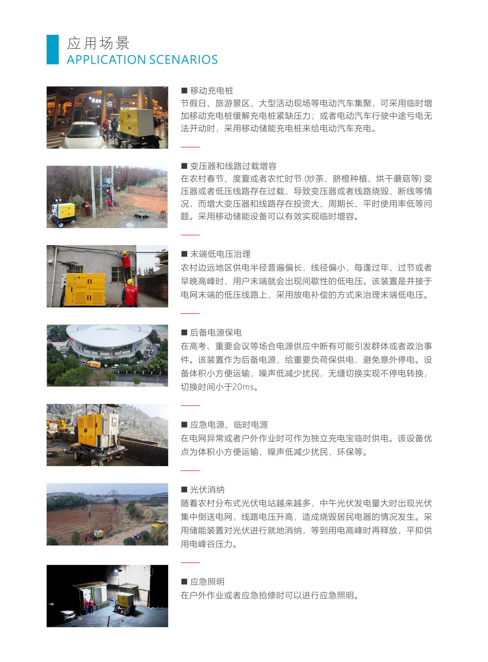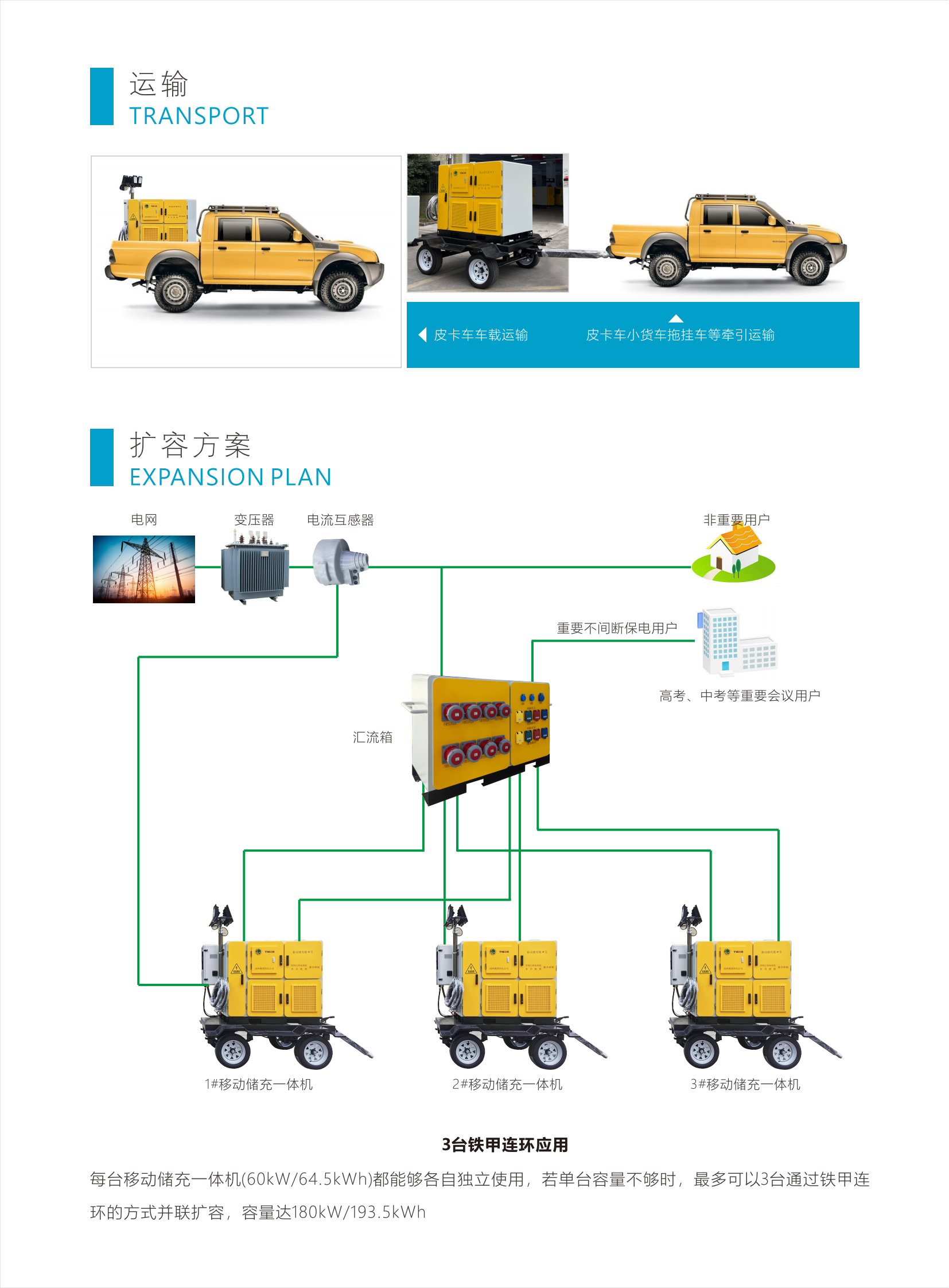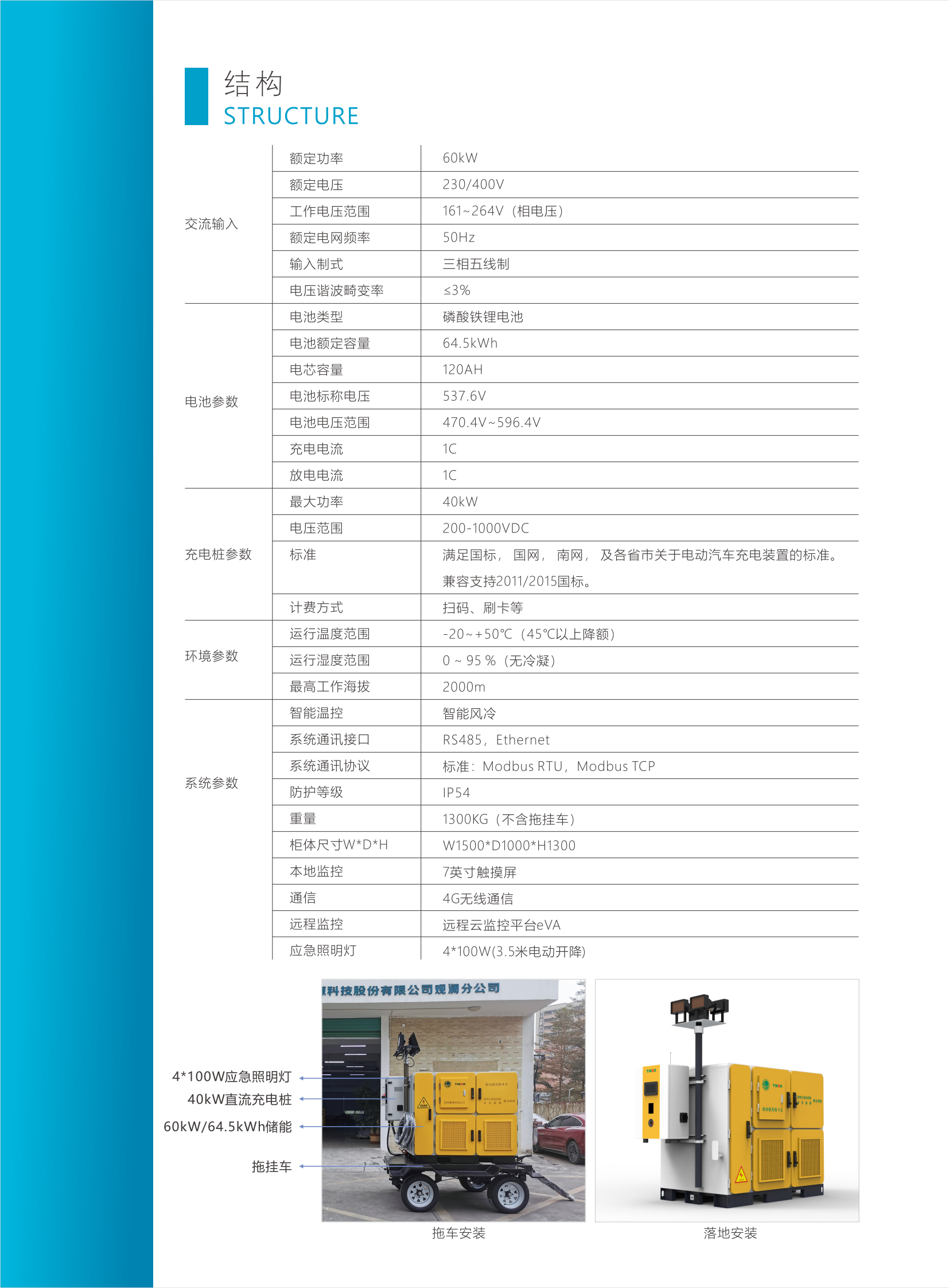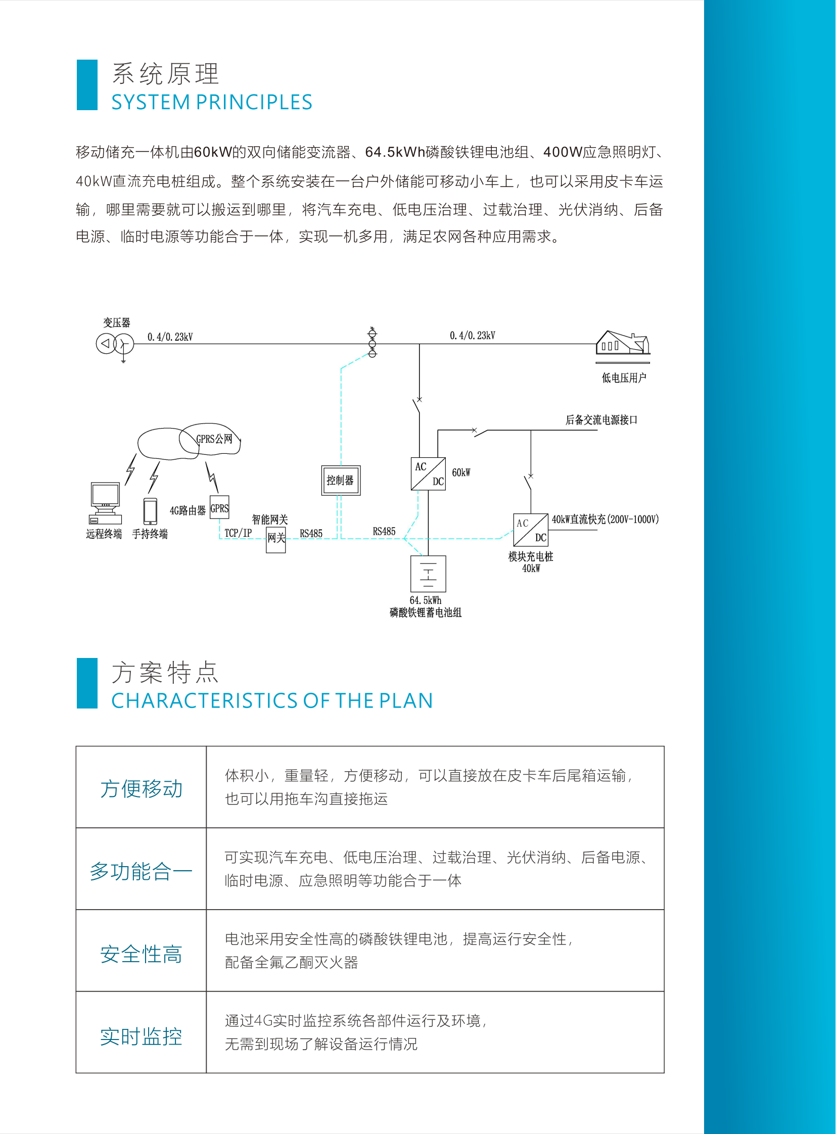 移动储充一体机由60kW的双向储能变流器、64.5kWh磷酸铁锂电池组、400W应急照明灯、 40kW直流充电桩组成。整个系统安装在一台户外储能可移动小车上,也可以采用皮卡车运输,哪里需要就可以搬运到哪里,将汽车充电、低电压治理、过载治理、光伏消纳、后备电源、临时电源等功能合于一体,实现一机多用,满足农网各种应用需求。